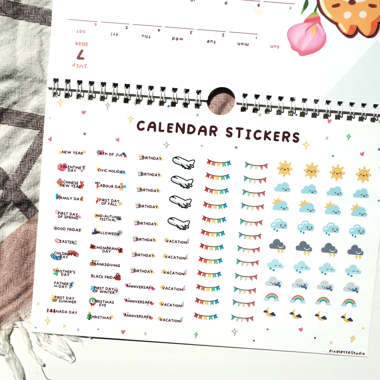 Start the new year with a colourful desktop or wall calendar! There are no holidays printed onto the calendar and instead, a sticker sheet of holidays and weather planner stickers are printed and binded with the calendar so you can decorate the calendar according to how you use it! Calendars are binded with double loop binding wire with a calendar wired hanger.